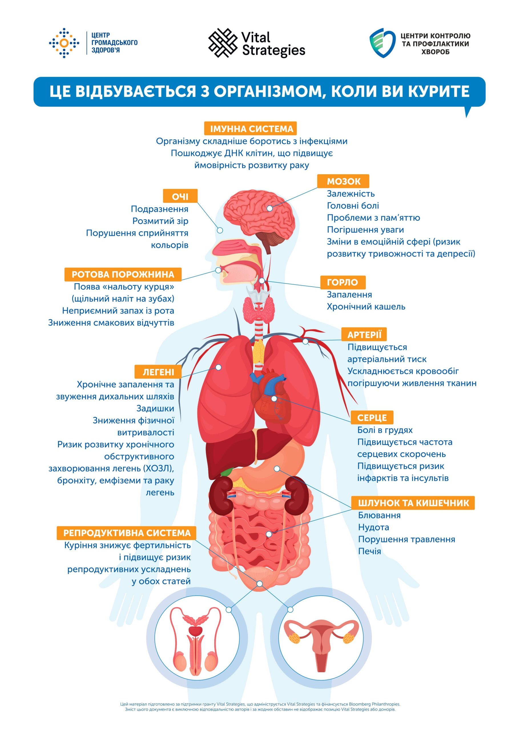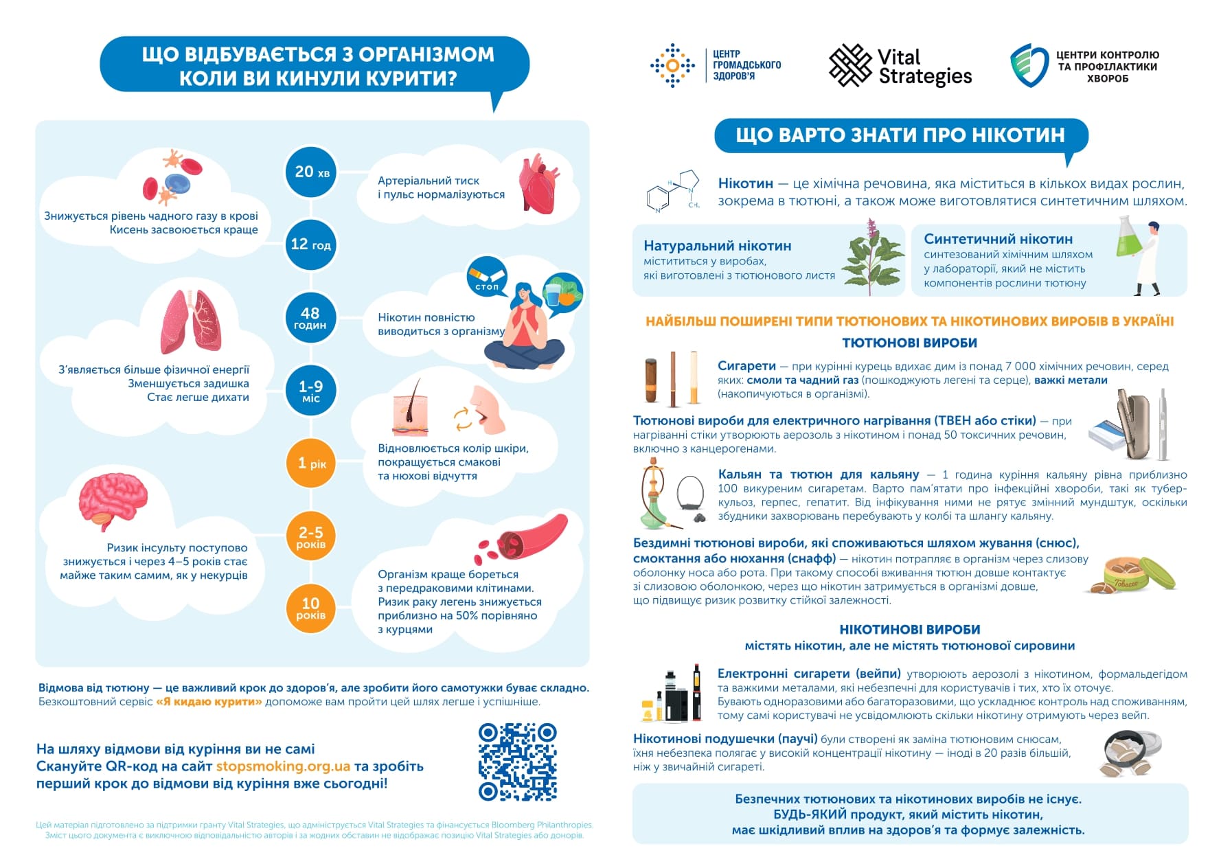 Крім цього, фахівцями Центру також розроблено плакат «Що відбувається з організмом, коли ви курите» на 1 арк. та ліфлет «Що варто знати про нікотин» на 2-х арк. (додаються).