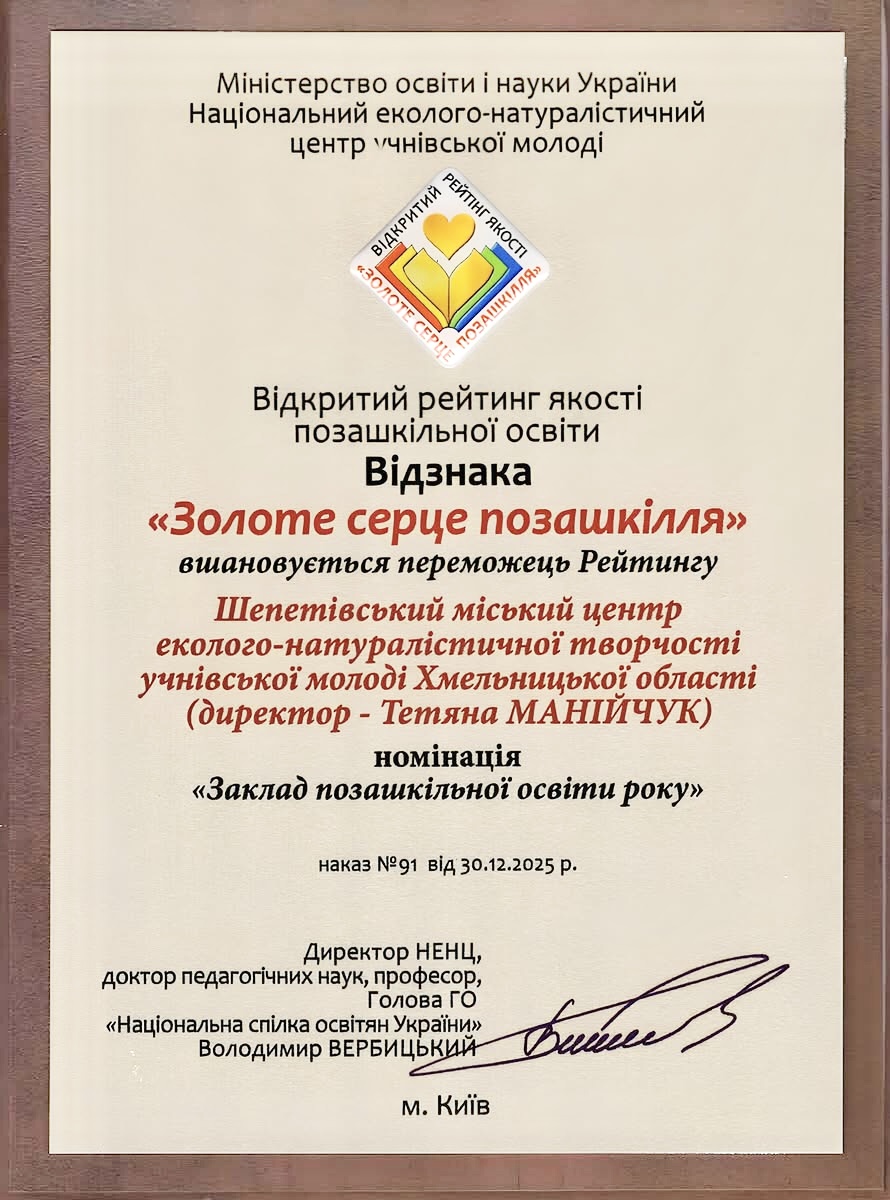 – Шепетівського міського центру еколого-натуралістичної творчості учнівської молоді (заступник директор Олена Філюк, керівник гуртка Аліна Марховська, практичний психолог Марина Стафеєва, директор закладу – Відмінник освіти – Тетяна МАНІЙЧУК).